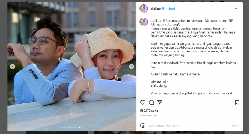 Instagram Atalia Praratya, istri Gubernur Jabar Ridwan Kami. KURUSETRA — Atalia Praratya, istri Gubernur Jabar Ridwan Kamil, menuliskan doa dan pesan haru setelah 12 hari berpisah dari putra sulungnya Emmeril Kahn Mumtadz alias Eril yang dinyatakan tenggelam di Sungai Aare, Bern, Swiss. Dalam akun Instagram pibadinya, Atalia menumpahkan perasaanya sekaligus mengunggah foto-foto kebersamaanya dengan Eril. […]
