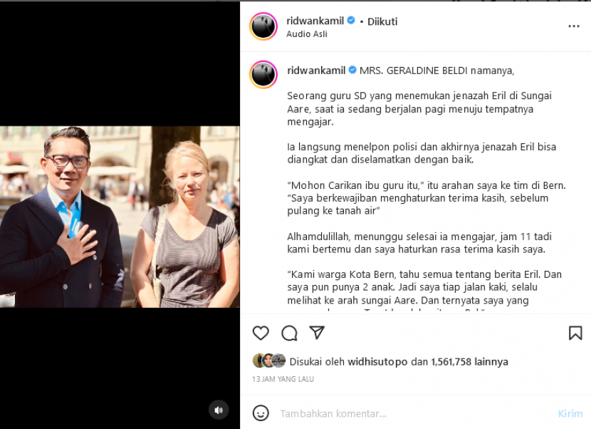 Gubernur Jawa Barat, Ridwan Kamil bertemu Geraldine Beldi, perempuan Swiss yang pertama kali menemukan jenazah Eril. Foto: Tangkapan Layar IG. KURUSETRA — Salam Sedulur… Gubernur Jawa Barat, Ridwan Kamil menghaturkan terima kasih yang sebesar-besarnya kepada seorang perempuan Swiss bernama Geraldine Beldi, yang pertama kali menemukan jenazah putra sulungnya, Emmeril Kahn Mumtadz atau Eril. Ridwan Kamil […]