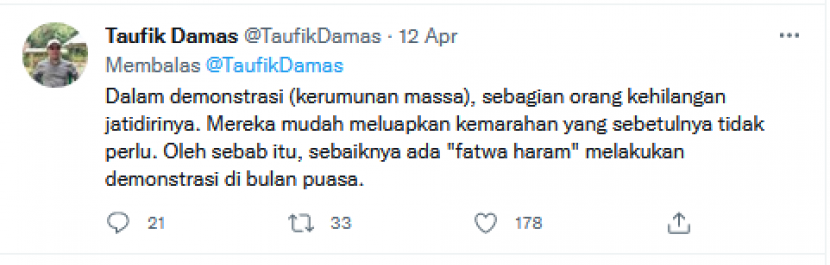 Wakil Katib Syuriah Pengurus Wilayah Nahdlatul Ulama (PWNU) DKI Jakarta, KH Taufik Damas mengusulkan diterbitkan fatwa haram demonstrasi di bulan Ramadan. KURUSETRA — Salam Sedulur… Wakil Katib Syuriah Pengurus Wilayah Nahdlatul Ulama (PWNU) DKI Jakarta, KH Taufik Damas mengusulkan diterbitkan fatwa haram demonstrasi di bulan Ramadan. Usulan Kiai Taufik ini menyusul kasus pengeroyokan terhadap Ade […]