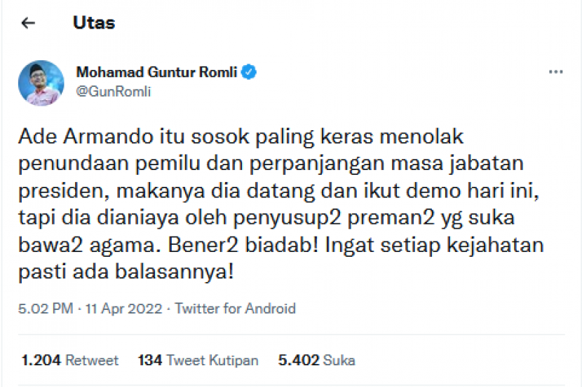 Twitter Guntur Romli mengomentari tentang pemukulan Ade Armando. Foto: Tangkapan Layar. KURUSETRA — Salam Sedulur… Pegiat media sosial, Ade Armando dipukuli massa di depan gedung DPR saat aksi demonstrasi 11 April 2022. Guntur Romli, mengatakan Ade Armando adalah orang yang tidak setuju dengan wacana presiden tiga periode. Namun, Guntur menuding Ade Armando dipukuli preman yang […]