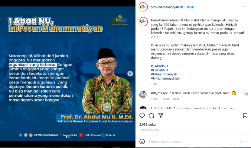 Muhammadiyah berpesan dan berharap NU semakin sukses di masa yang akan datang. KURUSETRA — Salam Sedulur… Nahdlatul Ulama (NU) menginjak usianya satu abad alias 100 tahun berdasarkan perhitungan kalender Hijriyah pada 16 Rajab 1444 H, sementara menurut perhitungan kalender masehi, NU genap berusia 97 tahun pada 31 Januari 2023. Muhammadiyah mengucapkan selamat dan memberikan pesan […]