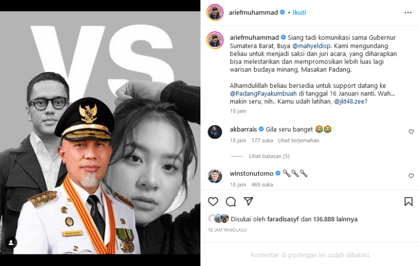 Makan nasi padang pakai sendok. YouTuber Arief Muhammad menantang member JKT48, Azizi Asadel (Zee) makan nasi padang memakai sendok. Foto: Tangkapan Layar Instagram. KURUSETRA — Salam Sedulur… Duel perlombaan makan nasi padang pakai sendok akan terjadi setelah Arief Muhammad, YouTuber yang dinobatkan sebagai Duta Nasi Padang, menantang member JKT48, Azizi Asadel (Zee) untuk makan nasi […]