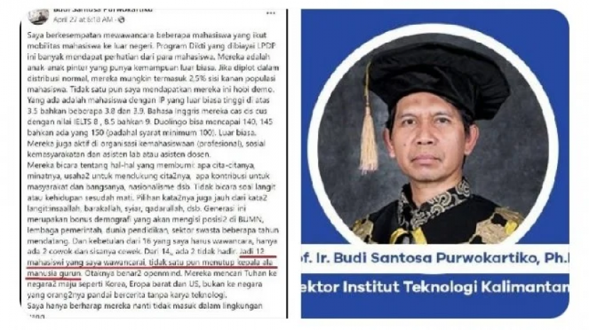 Rektor Institut Teknologi Kalimantan ( ITK) Prof Budi Santoso Purwokartiko panen hujatan tulisannya yang menyinggung pakaian penutup kepala mirip manusia gurun. Foto: tangkapan layar. KURUSETRA — Polemik Prof Budi Santosa Purwokartiko yang menyebut "penutup kepala seperti manusia gurun" dalam sebuah tulisannya di media sosial, menyeret nama Institut Teknologi Kalimantan (ITK). Budi dilantik menjadi Rektor ITK […]
